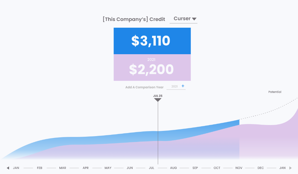 Overlaid graphs comparing data from multiple years, branches, or timeframes (year, quarter, month) for clearer insights